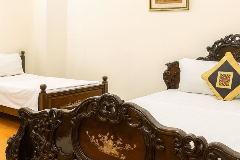 A spacious and comfortable room featuring one double bed and one single bed, ideal for small groups or families. The room offers classic wooden furnishings, clean modern amenities, and a bright window for natural light.